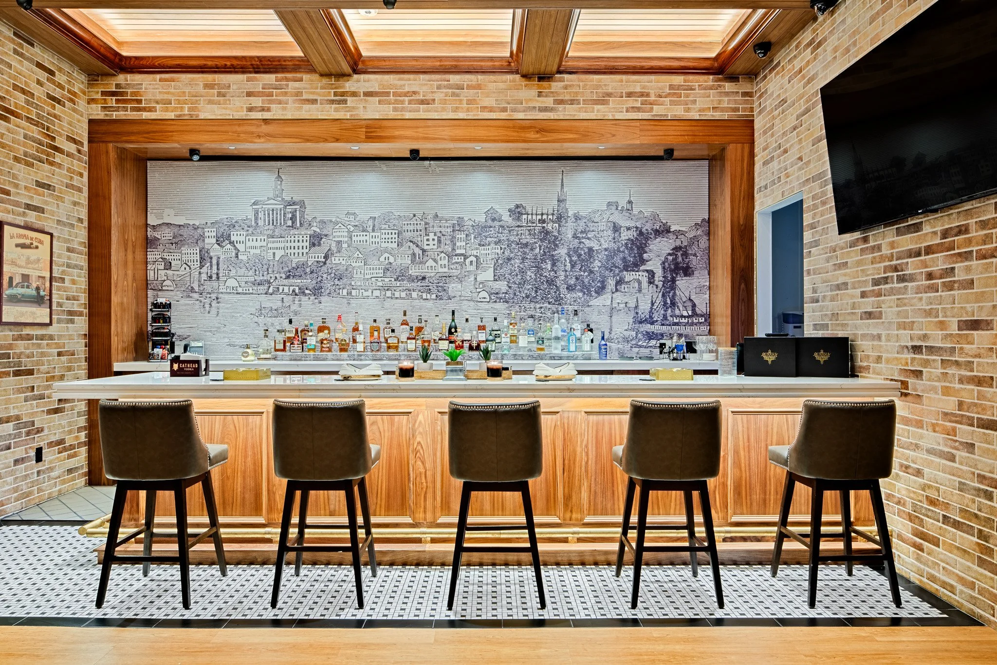 Elegant indoor bar with high counter, eight gray chairs, dark wood and marble surfaces, large windows showing a golf course outside, modern pendant lights, and a flat screen TV.