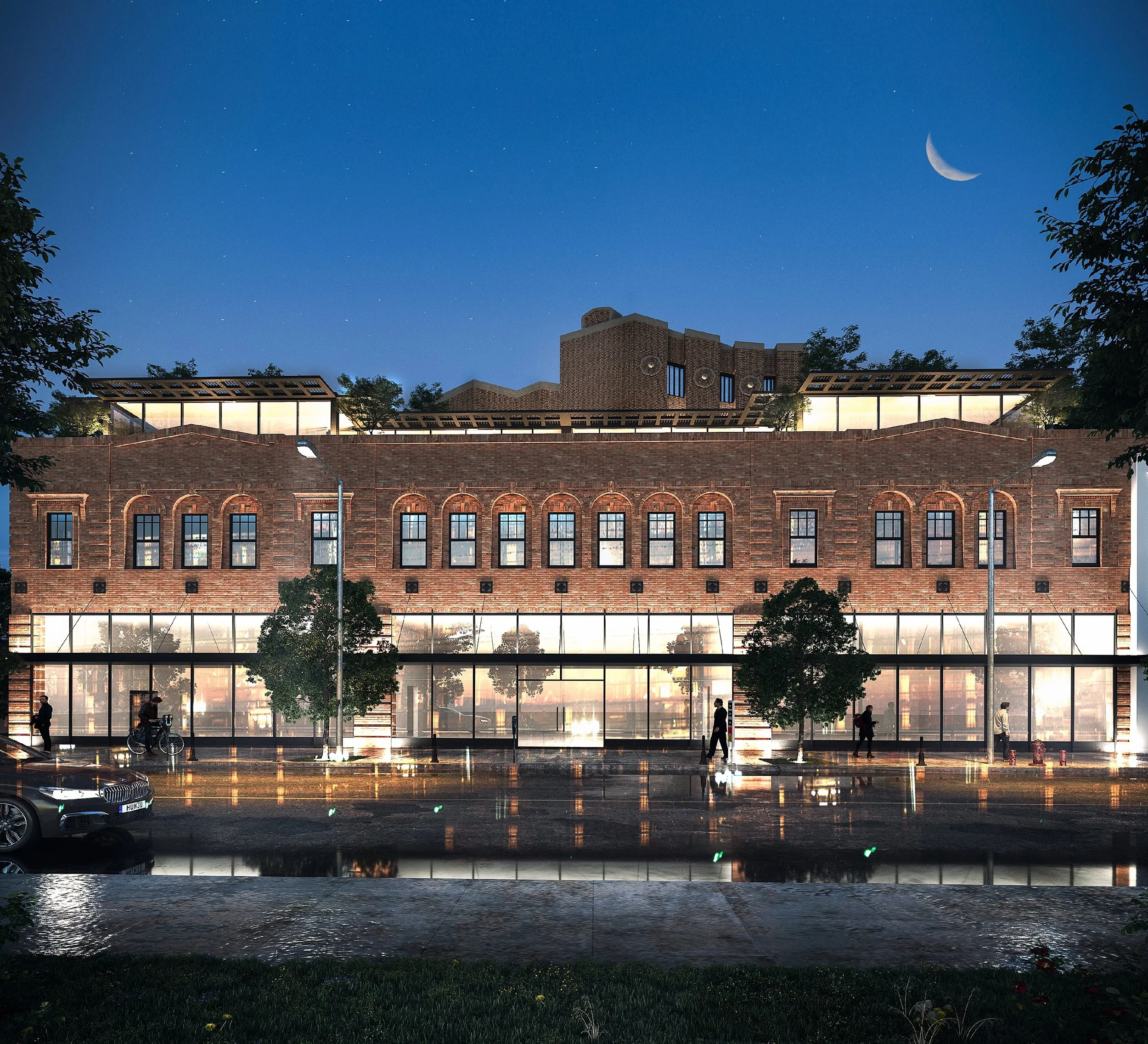 Nighttime photo of a modern brick building with large glass windows, trees, street lamps, and people walking by, a car parked in front, a crescent moon in the clear sky.
