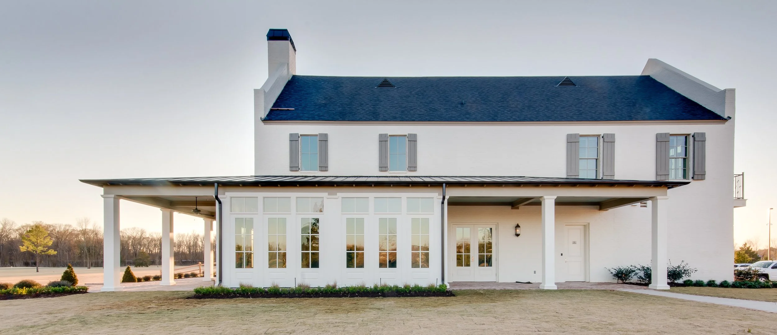 Exterior of a white building with black metal railings and stairs, overlooking a golf course, with a large windowed area and a green metal roof.